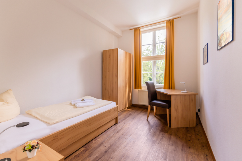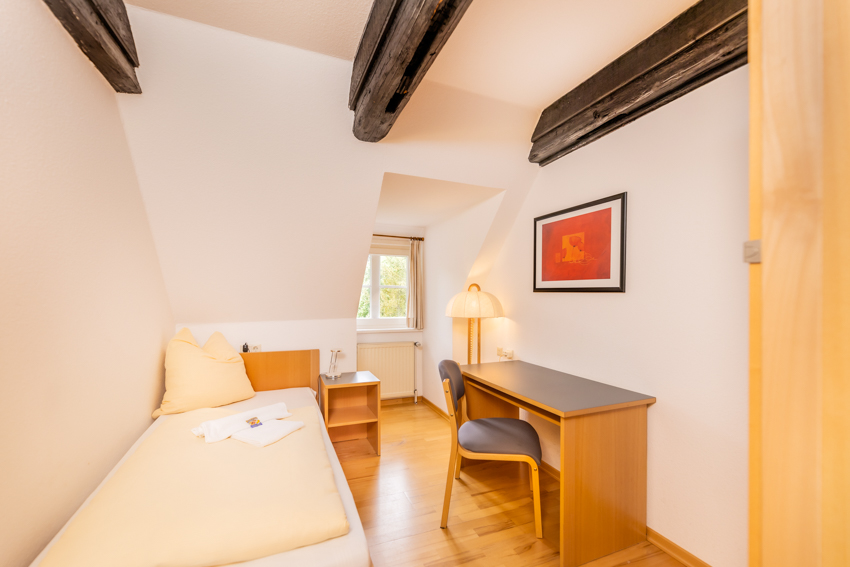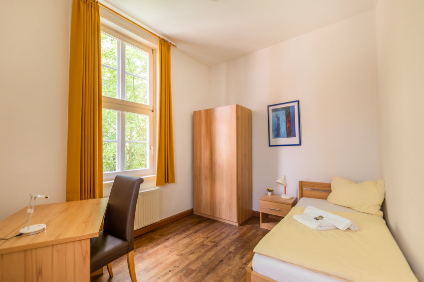 Aus unseren Zimmern fällt Ihr Blick auf unseren Park, das benachbarte Kloster oder die historische Anlage des GSI – hier schlafen Sie in traumhafter, ruhiger Umgebung.